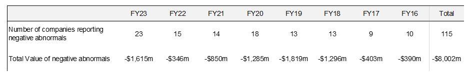 As well as frequency of abnormal items, another important feature is the size of the write-down. My hunch was that the quantum of write-down in this reporting season was also high. As the above table shows that was indeed the case with a total of $1.6 billion of negative abnormals. This is only surpassed by the $1.8 billion that vanished in Financial Year 2019. Out of interest, over 80% of that total was down to just two companies, Fonterra and Sky TV who wrote down the book value of their businesses by $801 million and $705 million respectively. For Fonterra that was principally a reassessment of the value their operations in China and Brazil, while for Sky TV it was essentially an acknowledgment of the impact of Netflix and other streaming services coming to New Zealand. This years negative abnormal are much more broadly spread with Precinct Properties, Vital Healthcare, Meridian Energy, Fletcher Building, Mercury, SkyCity and Auckland Airport, all reporting negative abnormals ranging from between $260 million and $100 million.